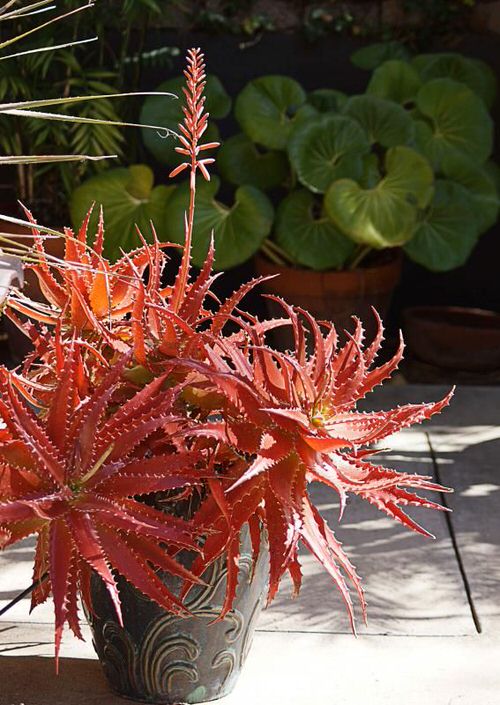 Sunset aloe changes its color to light green in partial shade and fierce shiny red in full sun. The foliage develops white spikes beside its edges when exposed to bright light.