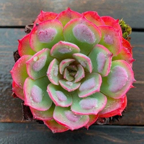 Also known as Dream Color, this showy succulent offers a rosette of spoon-shaped fleshy leaves with a creamy-yellow center that slowly changes into the bright pink-orange color with a thin rose-red band at the margins.