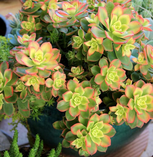 This branching succulent has fleshy yellow-green leaves adorned in bright red tips. The color will get more intense in winter in response to cool nights and bright sun.