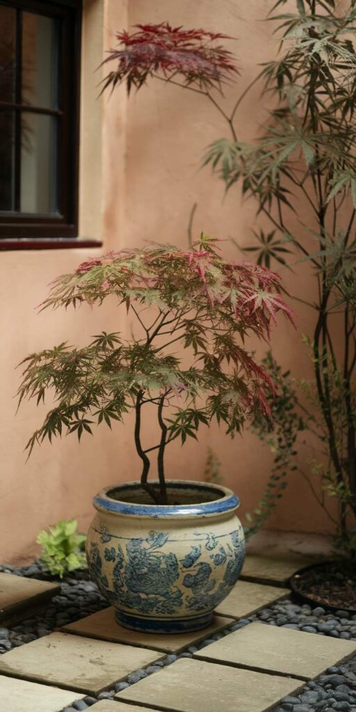 Opt for dwarf trees like lemon, olive, or Japanese maple to add height without overwhelming the space. These small trees can be potted and moved around when needed.