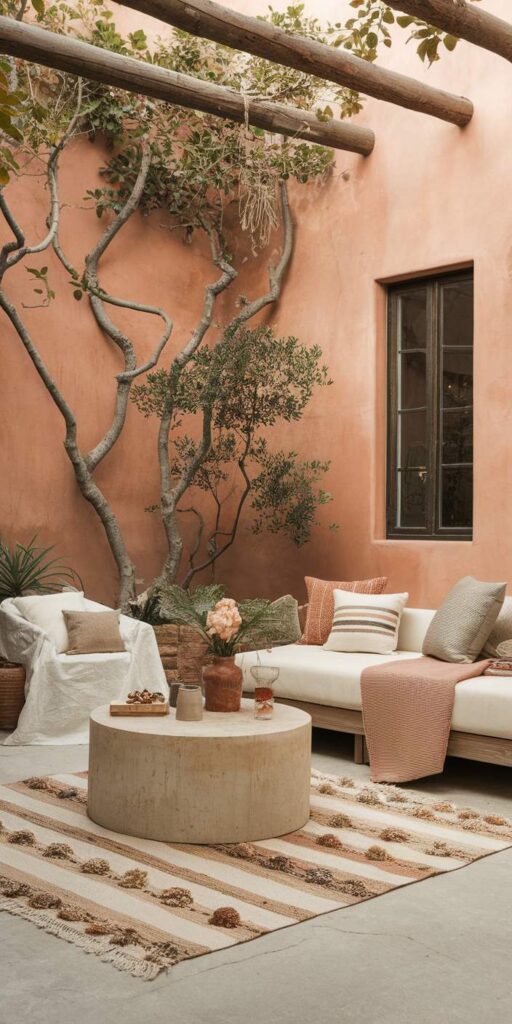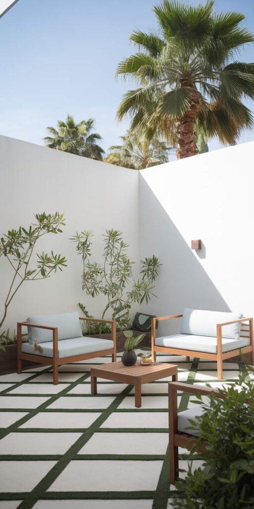 Define your courtyards layout with an outdoor rug, adding texture and warmth. Choose a weather-resistant material with vibrant patterns to enhance the overall aesthetic.