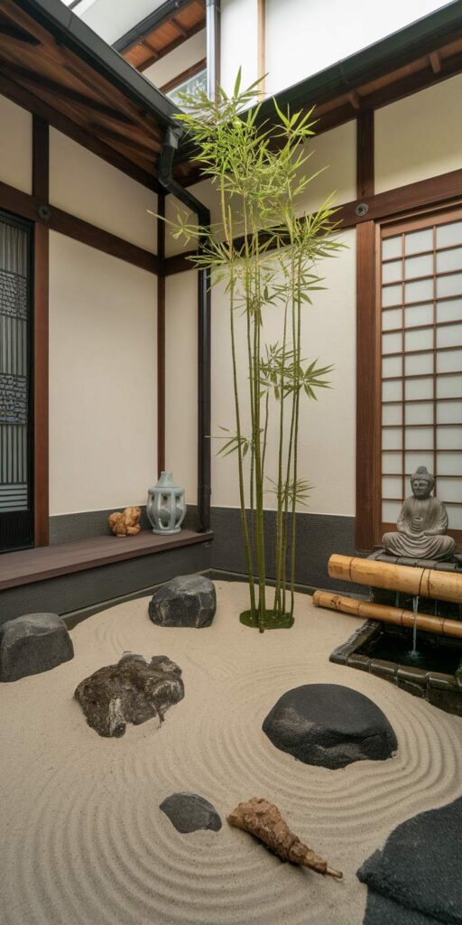 Incorporate elements like pebbles, a bamboo fountain, and a small Buddha statue for a peaceful sanctuary. Use a small sand garden with carefully placed rocks for an authentic Zen-inspired look.