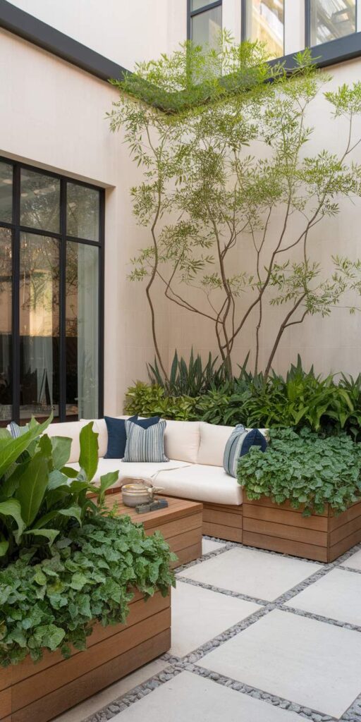 Design your seating areas with built-in planters to combine comfort with greenery. Using stone or wood for integrated planter seating can enhance the natural aesthetic of the space.