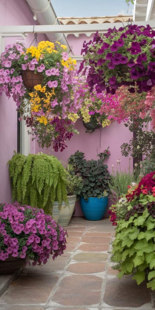 Utilize ceiling space by hanging baskets filled with trailing plants like petunias or ferns. This adds layers of greenery without cluttering the ground, keeping the space airy and open.