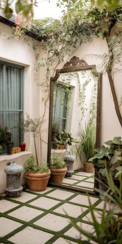 Strategically placing mirrors can make your courtyard appear larger by reflecting light and greenery. Use antique or distressed mirrors for a vintage charm, or opt for frameless mirrors for a modern touch.