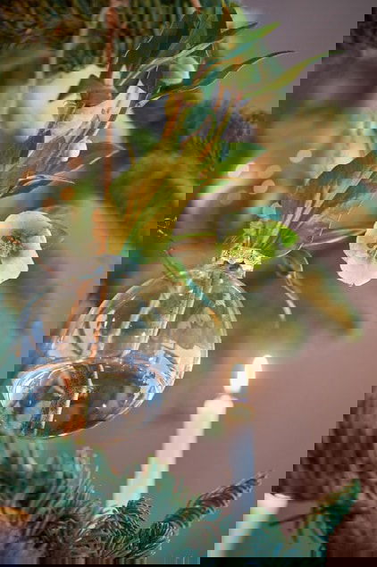 Using a twine, you can hang glass bowls with fake or real flowers on the Christmas tree for an added charm.