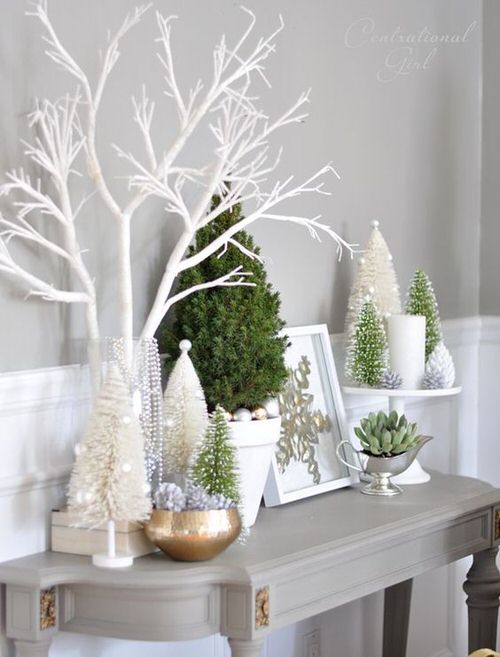 You can create a festive look on the table with indoor plants, miniature metal Christmas trees, and flowers.