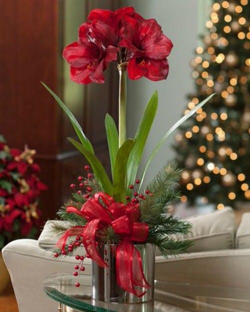 The tall stalks of amaryllis with beautiful red flowers is going to pair well with the Christmas tree decoration.