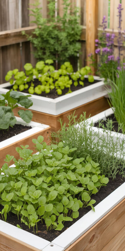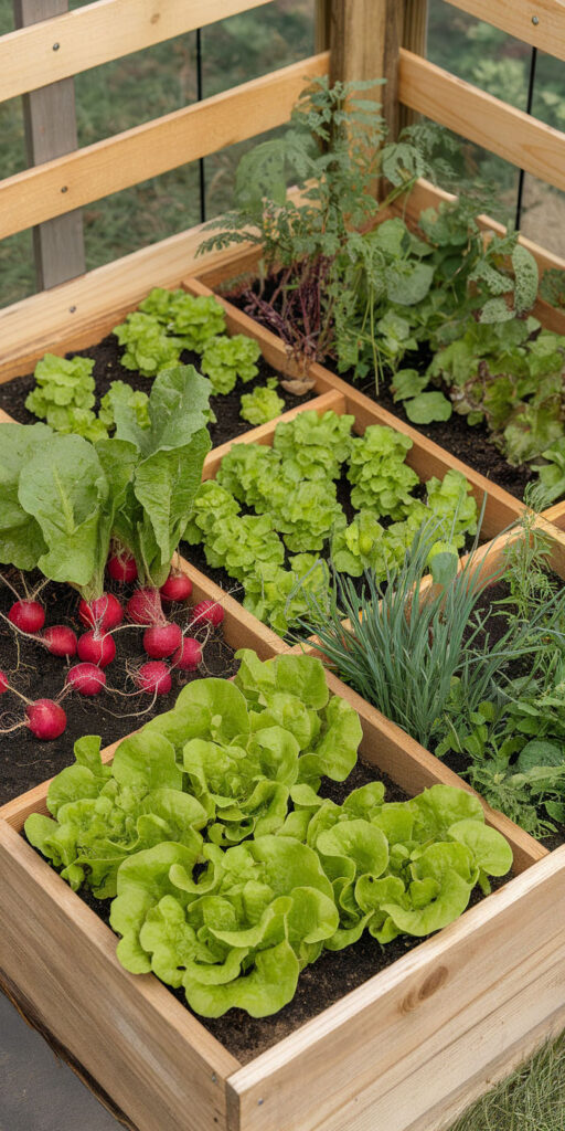 - Example: Lettuce, radishes, and herbs in a single 4Ã4 raised bed.