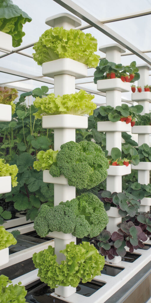- Example: Lettuce, kale, and strawberries in a hydroponic tower.