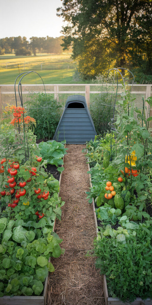 - Example: Tomatoes, cucumbers, and lettuce surrounding a compost bin.