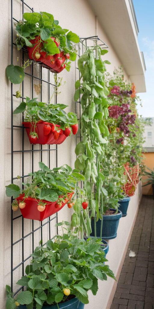 - Example: Pole beans, peas, strawberries, and cherry tomatoes in hanging baskets.