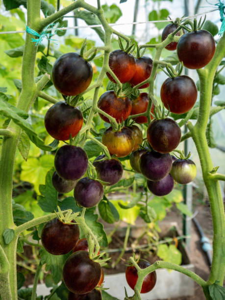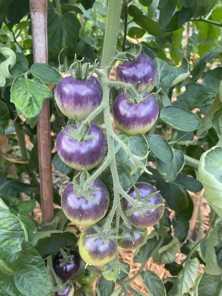 Little dark-skinned tomatoes that look like blueberries (ish). High in antioxidants, slightly tart when underripe, sweeter when fully red below the skin.