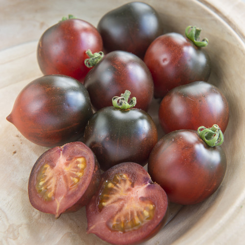 A moody queen. Deep purplish-brown skin, rich flavor, and a smoky sweetness. Grows like a beast and looks stunning in a mixed tomato bowl.