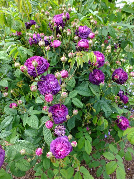 Also known as violet-blue or blue rambler , this easy to maintain variety forms crimson, purple, and blue fragrant flowers, in full sun. Almost thornless, it produces medium-green foliage.