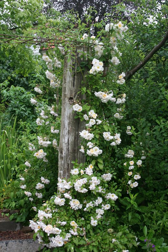 This thornless rambling rose comes in a huge cluster of small white and yellow flowers. The plant flowers in early spring or late summer, in full sunlight and emits a strong, fruity scent.