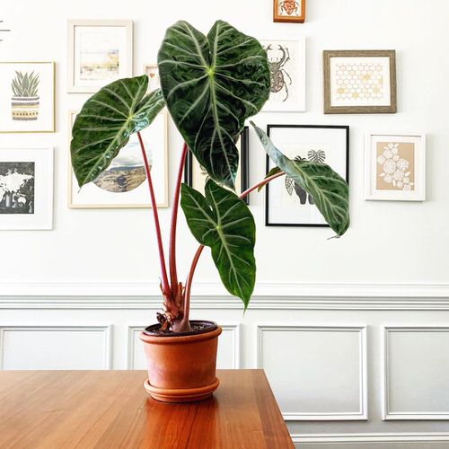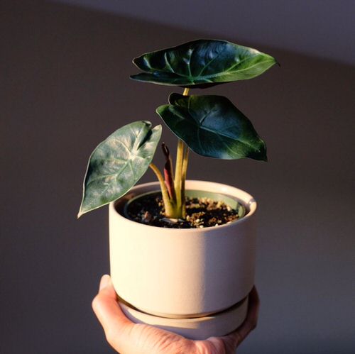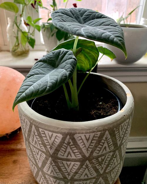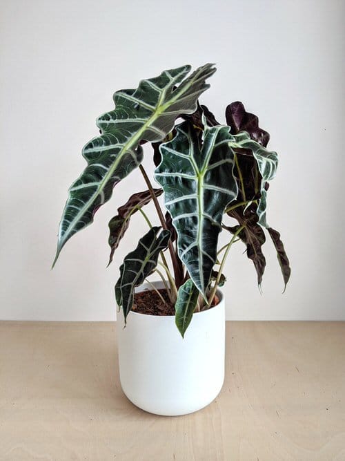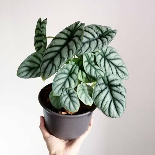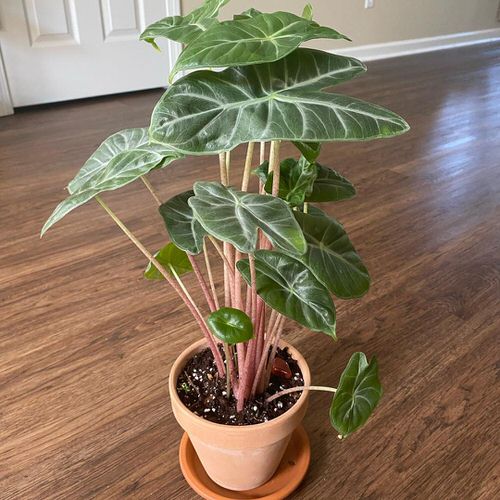 Commonly known as Alocasia Green Velvet, it resembles Alocasia Polly in shape, color, and size. It displays velvety, deep-green leaves with prominent white veins on the leaves.