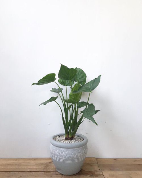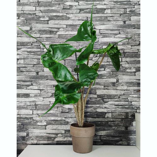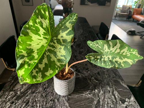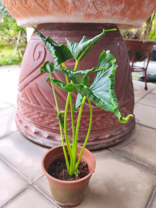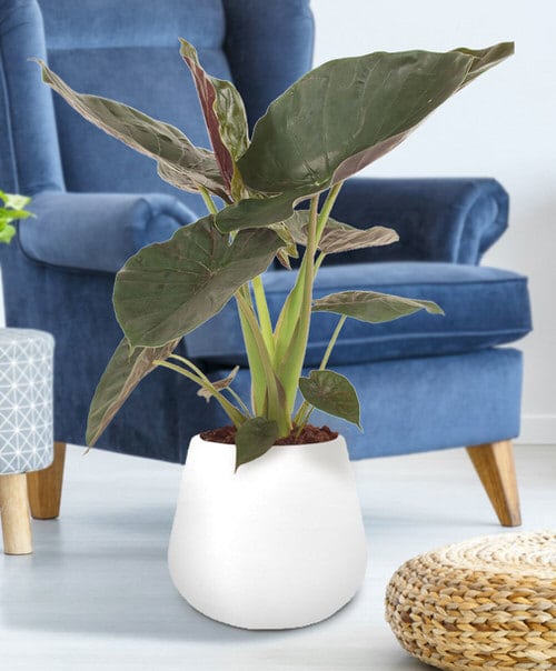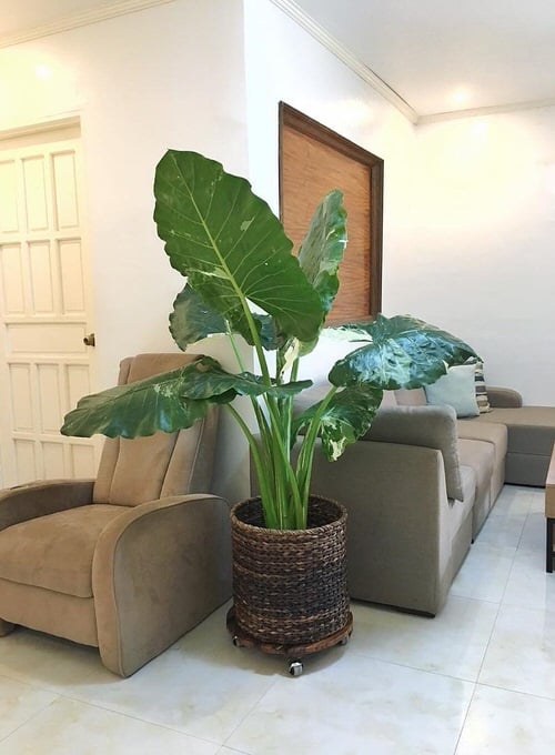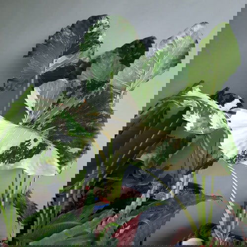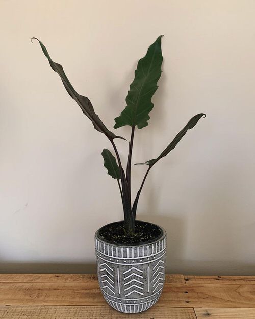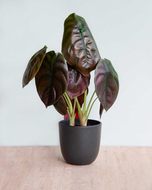 Also known as Alocasia rugosa, it offers unique large thick green leaves with a rough texture and prominent deep veins. The plant remains stubby and is great for small pots.