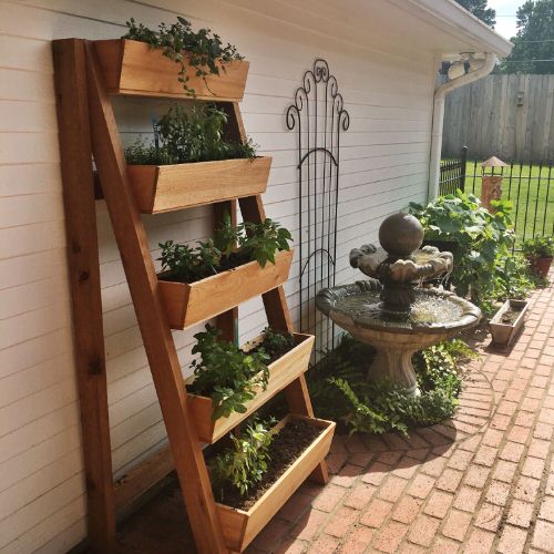Save a lot of space by growing plants in a wooden tiered garden arrangement.