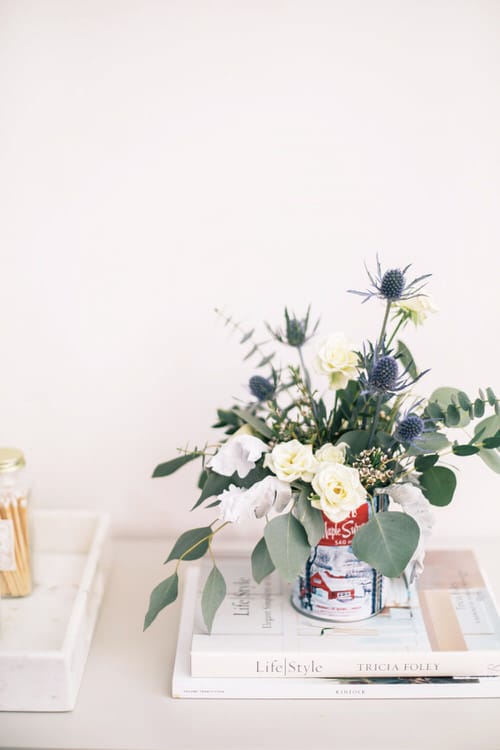 A small tin can will make for a beautiful centerpiece to keep white wax flowers, blue thistle, white spray roses along with eucalyptus leaves.