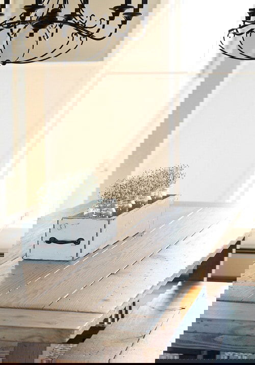 This super easy and cheap to make centerpiece uses just wooden boards. Details are here.