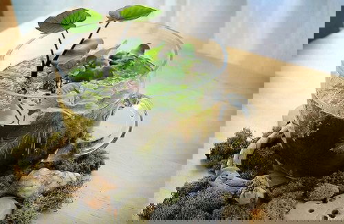 Use a large glass teacup to grow taro, water lettuce, water hyacinth, duckweed, and fairy moss on a tabletop.