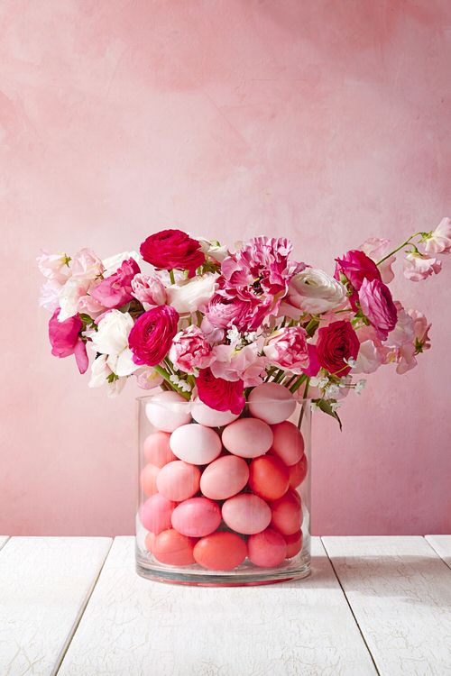 Use two glass vases of different sizes and hard-cooked eggs to display beautiful flowers. Details are here.