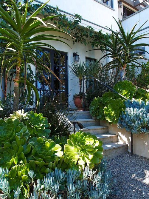 Succulents in tall planters like these are a visual delight. Tall planters improve the curb appeal of the home as well.