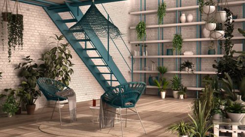 A plant shelf, a blue staircase, and chairs make for appealing room decor.
