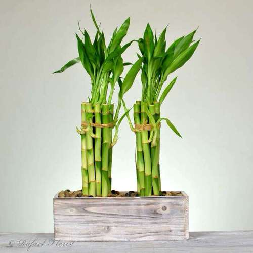 Two lucky bamboos in a wooden planter will be a charming addition to a table.