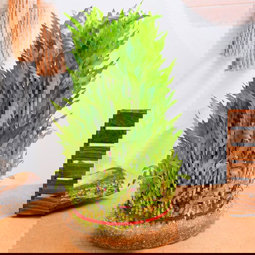 This braided bamboo looks really charming in a shiny white planter with a red piece of cloth.