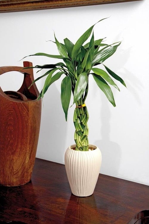 This braided lucky bamboo looks marvelous in a white pot on a wooden table.