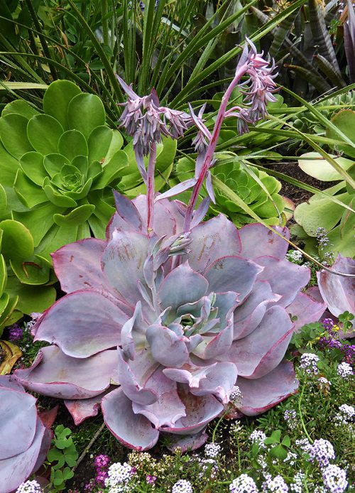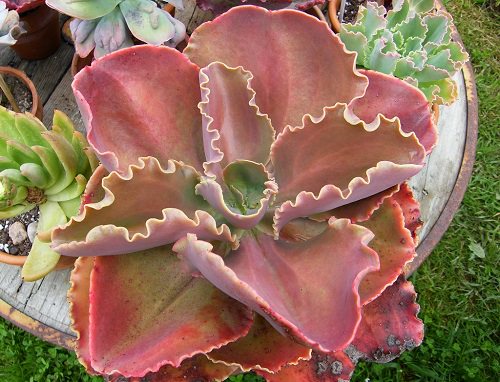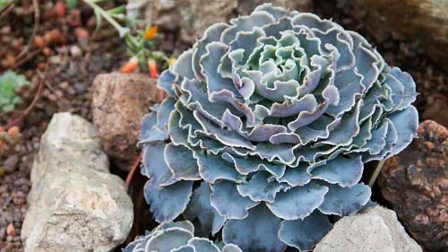 The blue-green leaves of this Echeveria have ruffled edges, with symmetrical coral margins. It produces pink-orange flowers during summers.
