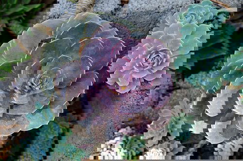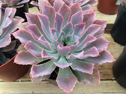 Another famous hybrid variety of Echeveria that forms purple rosette with pink edges. It gets brighter under direct sunlight.