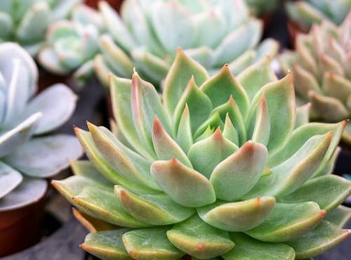 This echeveria has a soothing salmon color with magenta leaf tips. Looks magnificent when paired with dark-colored succulents.