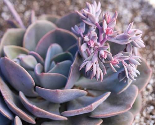 This charming fast-growing Echeveria is a hardy that features a light silver-green, curvy, slightly upward leaves. It interestingly gets a violet edge on the leaves when stressed.