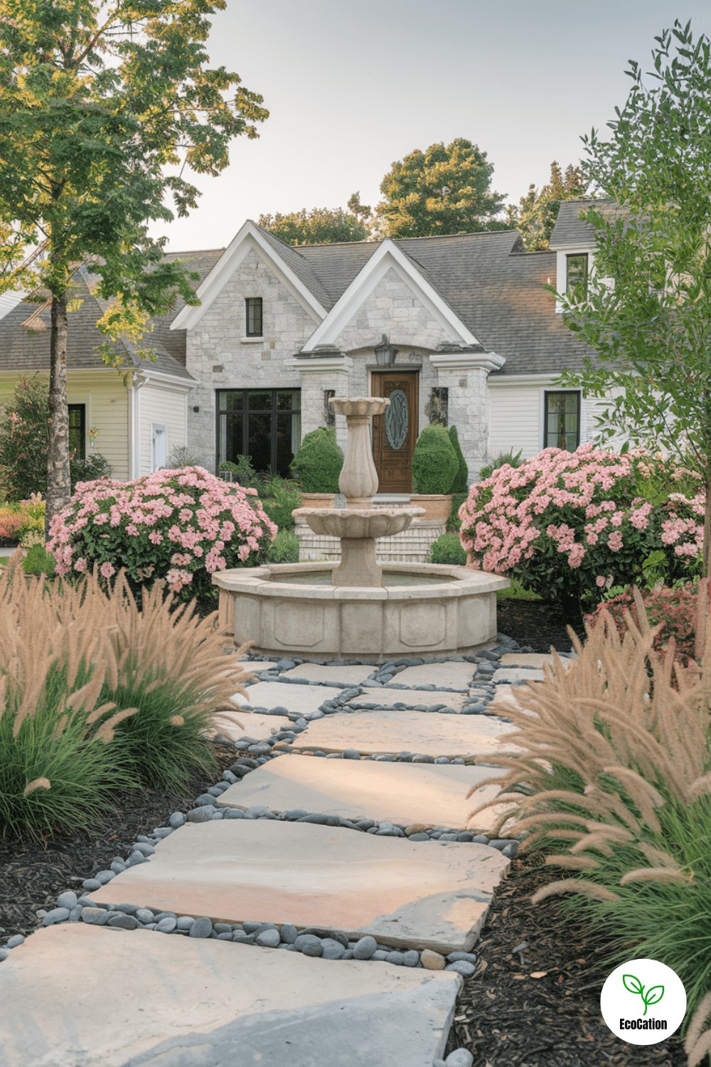 Add a stunning stone fountain to your front yard, surrounded by sun-loving flowering shrubs and ornamental grasses. The combination of water and plants creates a peaceful oasis that thrives under full sun. Choose plants like lavender or hibiscus for a splash of color and fragrance, while the fountain adds a calming sound to your garden.