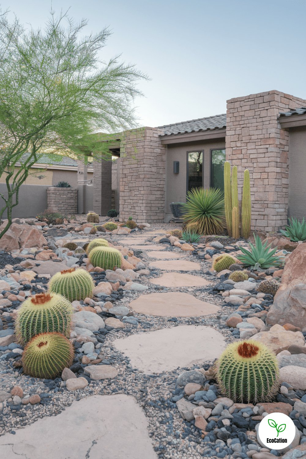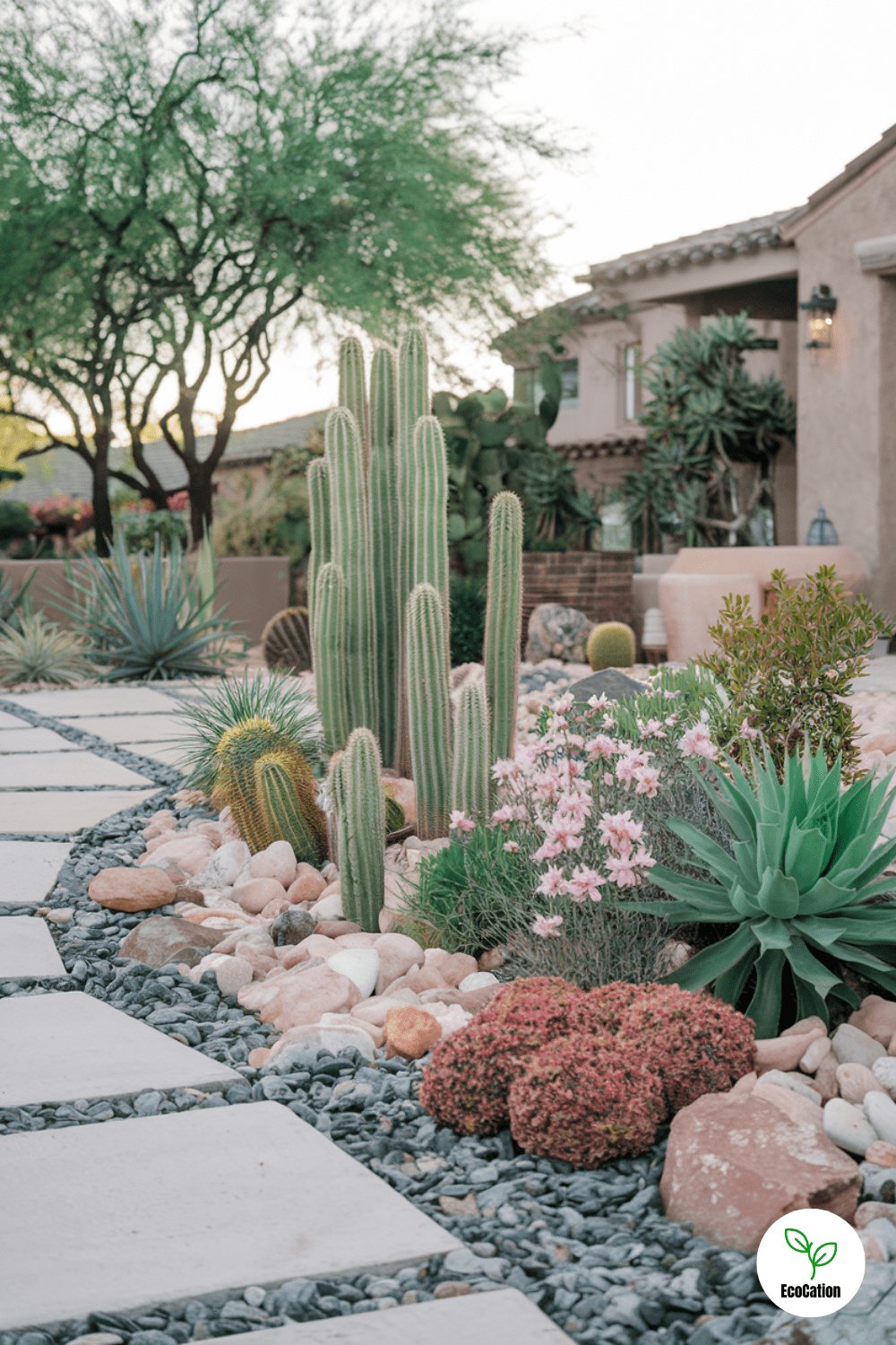 A xeriscape front yard with cacti, succulents, and decomposed granite pathways creates a striking desert landscape. These drought-tolerant plants thrive in full sun, requiring little water. Use a mix of shapes and sizes for visual interest, and design your garden with sweeping, simple lines to evoke a sense of calm and tranquility.