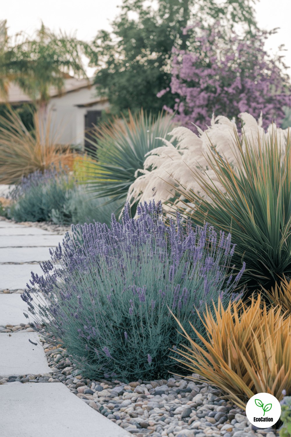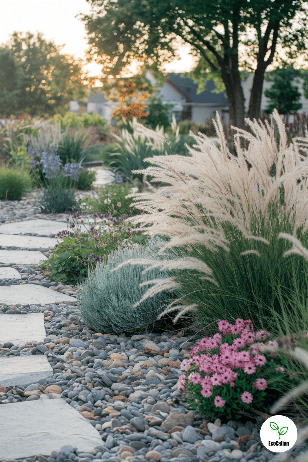 Incorporate tall ornamental grasses, river stones, and drought-resistant flowers into your front yard for a textured, dynamic landscape. These plants add movement and depth, thriving in full sun. The combination of soft grasses and bold stone elements creates a visual contrast that s both interesting and easy to maintain.