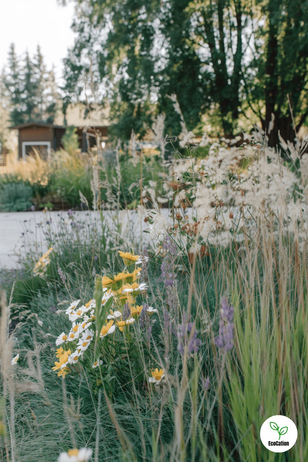 A front yard with a variety of native wildflowers, grasses, and shrubs creates a sustainable, eco-friendly landscape. These sun-loving plants are low-maintenance, attracting bees and butterflies to your garden. Use wildflower mixes and ornamental grasses to add texture and movement, creating a dynamic and vibrant outdoor space.