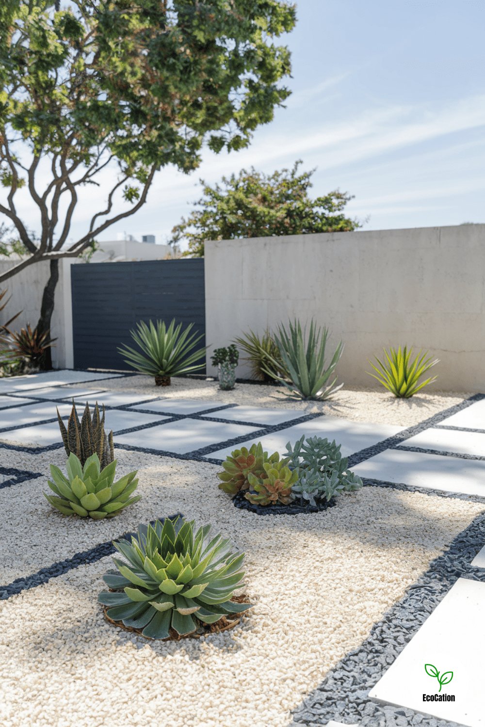 Design a modern minimalist front yard with smooth gravel surfaces, geometric plant arrangements, and sculptural succulents. This low-maintenance, full-sun landscape thrives with minimal water. The clean lines of gravel and simple plant arrangements create a sleek, contemporary look that s perfect for those who appreciate a fuss-free, modern aesthetic.
