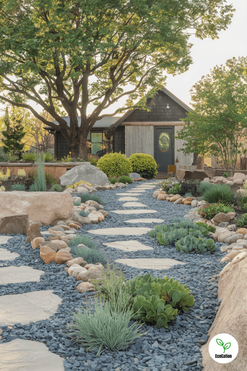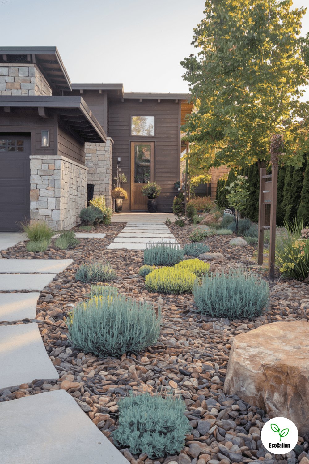 Combine large decorative rocks, gravel pathways, and drought-resistant greenery for a front yard that blends rugged beauty with sun-resilient plants. The contrast between the stones and greenery creates a bold, natural look, while the drought-tolerant plants require minimal care, thriving in full sunlight with ease.