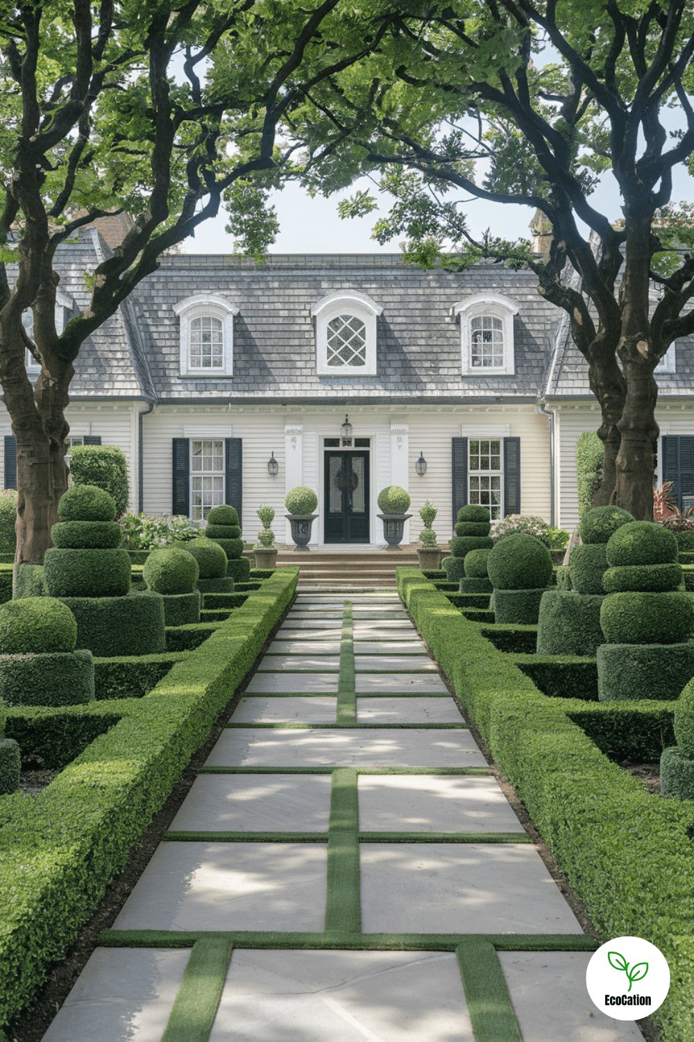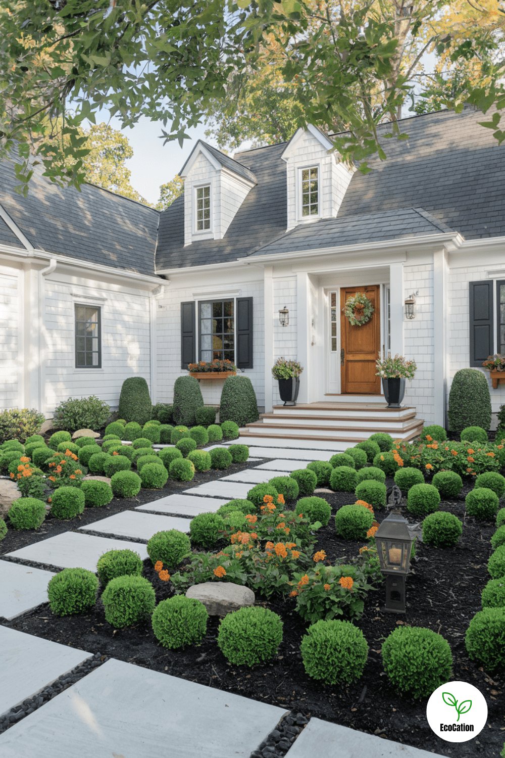 Create a timeless front yard with neatly arranged evergreen shrubs, decorative stones, and a structured layout. Evergreen plants like boxwoods, holly, and junipers thrive in full sun and provide year-round greenery. Add decorative elements like statues or birdbaths to complete the look and maintain visual interest through every season.
