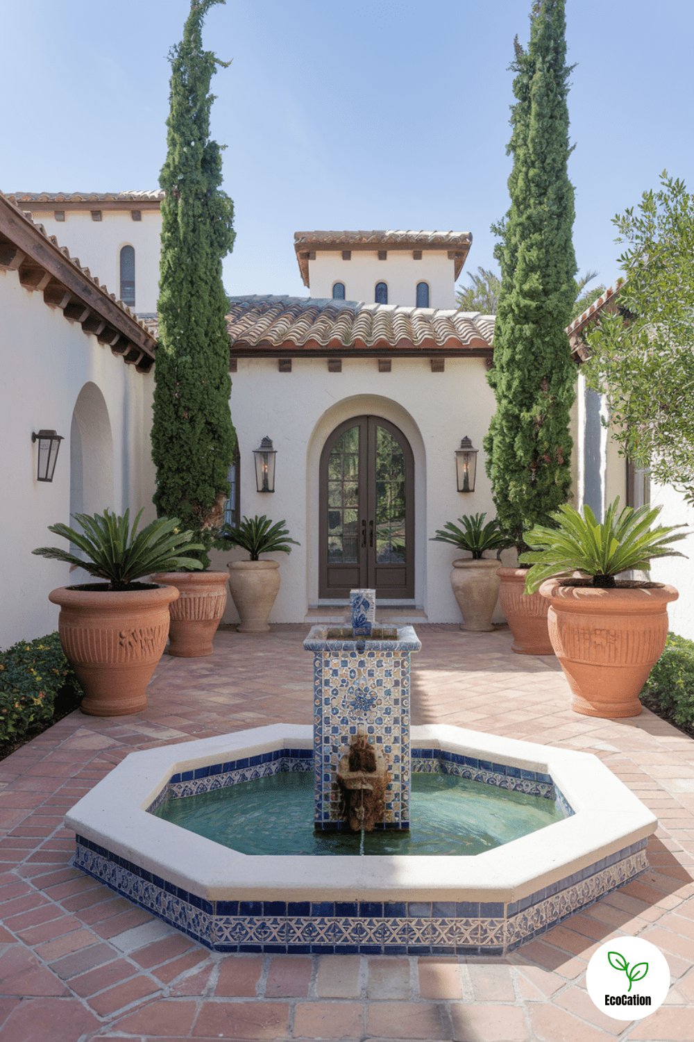 Create a Mediterranean courtyard-inspired front yard with terracotta planters, tall cypress trees, and a decorative tiled fountain. These sun-loving plants thrive in hot climates, and the warm-toned planters and fountains provide a relaxing, inviting atmosphere. Incorporate warm colors and Mediterranean-style furniture to complete this sun-drenched oasis.