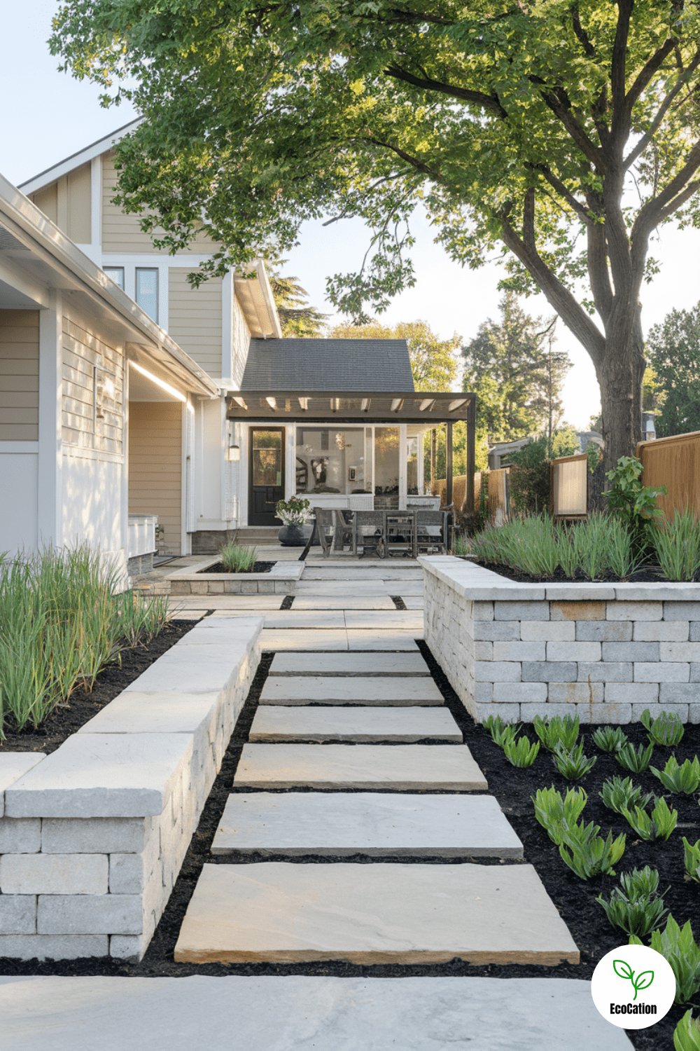 Add natural stone retaining walls, elevated planters, and a mix of sun-loving greenery for a structured front yard design. The retaining walls create levels within your garden, providing visual interest while the sun-loving plants thrive in the direct sunlight. Incorporate decorative elements like lanterns or sculptures to add personality.