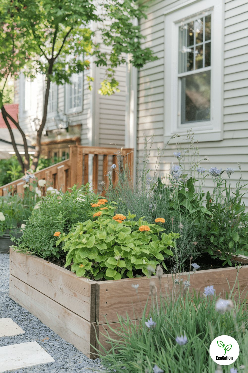 A raised wooden garden bed filled with sun-loving herbs, flowers, and small fruit-bearing plants creates a functional yet beautiful space. Plants like basil, thyme, and strawberries thrive in full sun, while the raised bed design allows for better drainage and easy access. It s perfect for anyone who wants a productive garden with minimal effort.