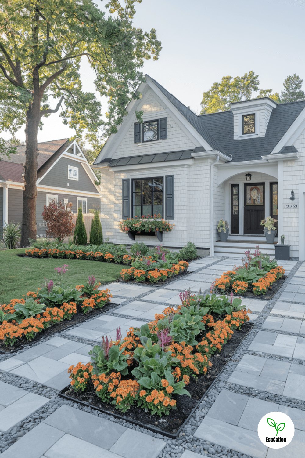 Opt for a front yard with neatly structured flower beds, paved walkways, and vibrant border plants. These sun-loving flowers like petunias, marigolds, and zinnias will add color and life to your yard, while the structured layout creates a clean, organized look. Use paving stones or bricks for the walkway to add sophistication and definition.