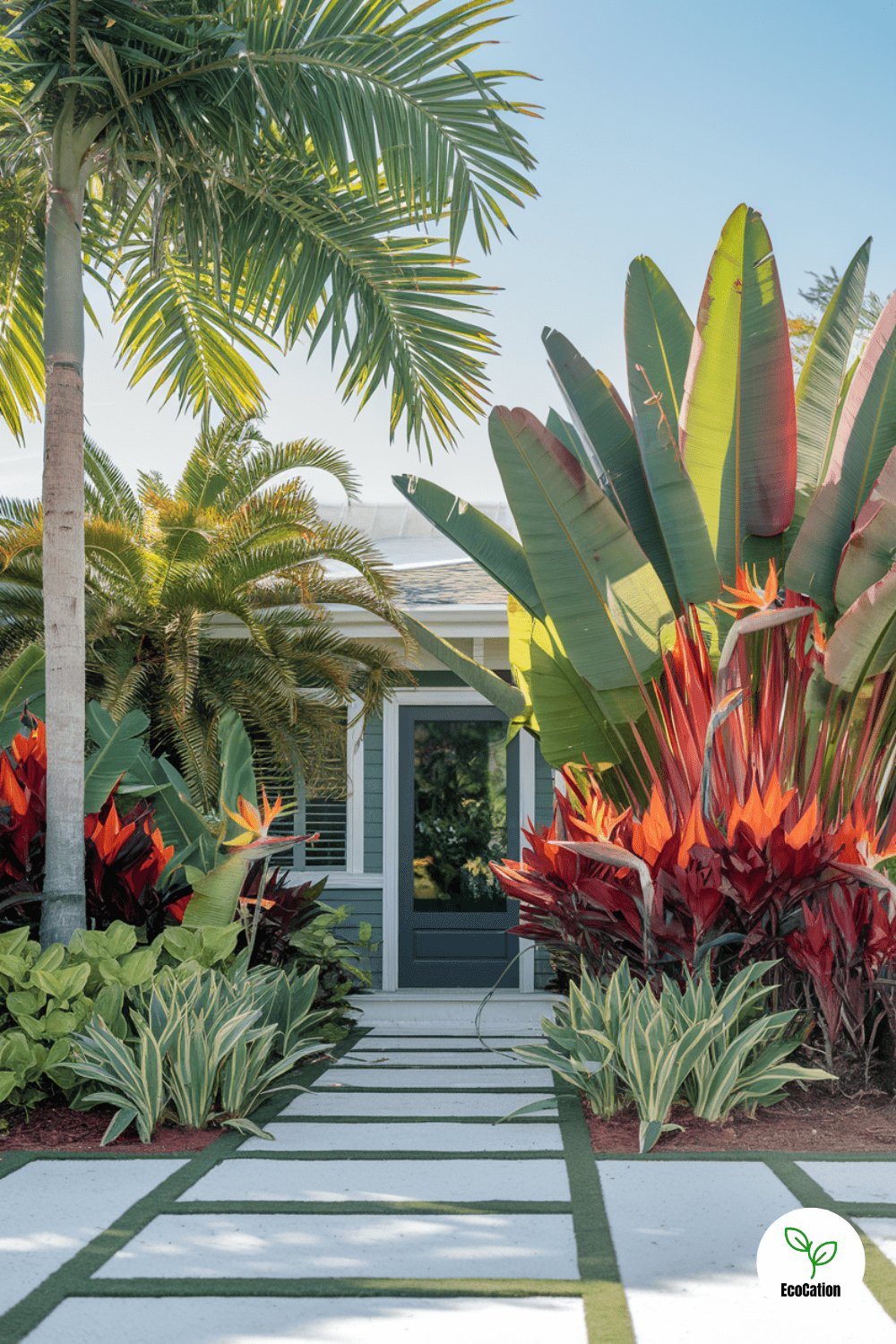 Create a tropical-themed front yard with towering palms, bird of paradise flowers, and lush greenery that thrives in direct sunlight. These plants add a vibrant, exotic touch to your yard, perfect for full sun exposure. Consider using large palms as focal points and layering colorful flowers for a lush, tropical paradise.