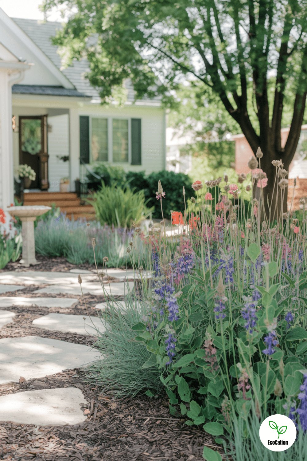Design a pollinator-friendly front yard with native flowers, butterfly bushes, and a small birdbath. These plants attract bees, butterflies, and birds, creating a habitat for local wildlife. Choose bright, sun-loving flowers like coneflowers, sunflowers, and asters to create a colorful, eco-friendly landscape that thrives in full sun.