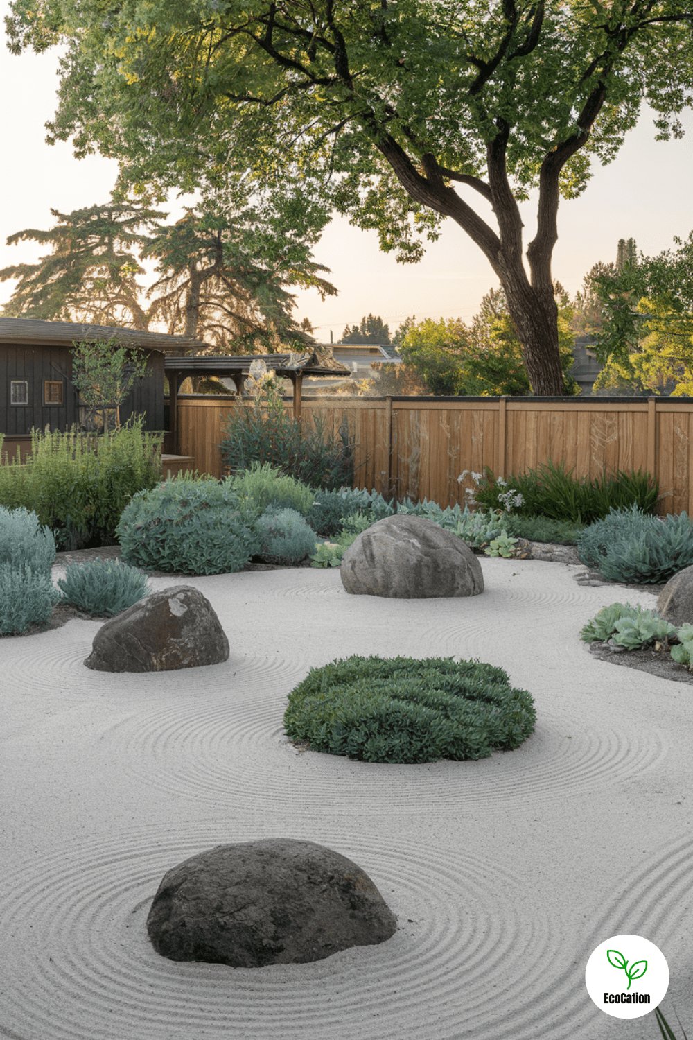 Design a peaceful Zen-inspired front yard with raked sand, carefully placed boulders, and drought-tolerant greenery. This minimalist landscape creates a tranquil space that thrives in full sun. Incorporate smooth stones and low-maintenance plants like succulents to add texture and balance, creating a serene outdoor retreat.